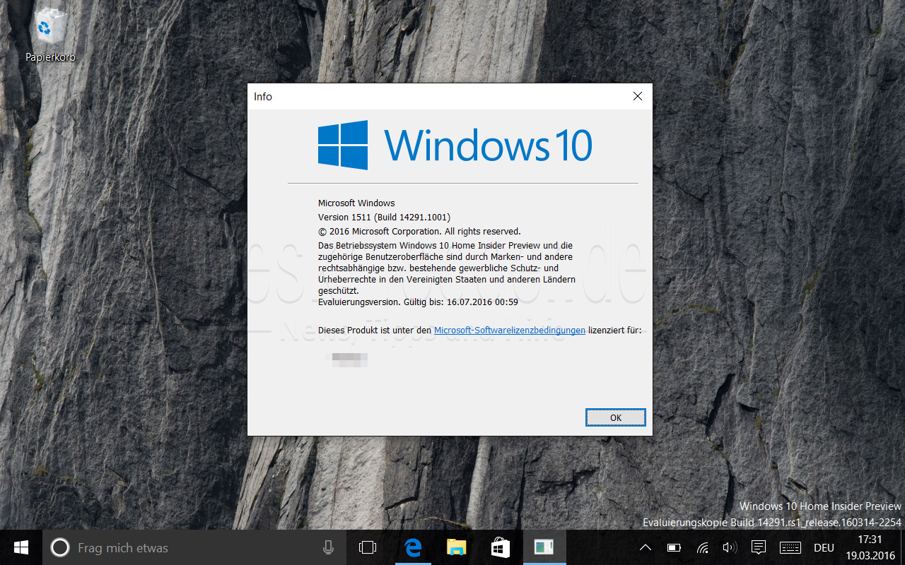 Winver - Windows 10 Build 14291 | Deskmodder.de
